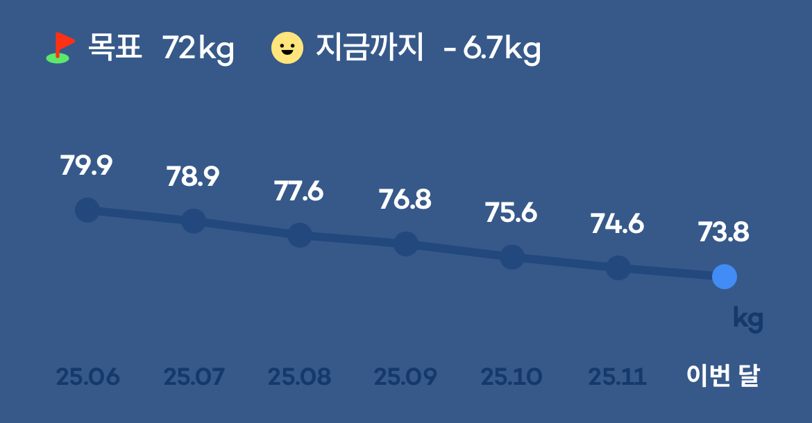 2025년 6월 80키로로 시작해서, 2026년 1월 2일 73.7을찍었다.